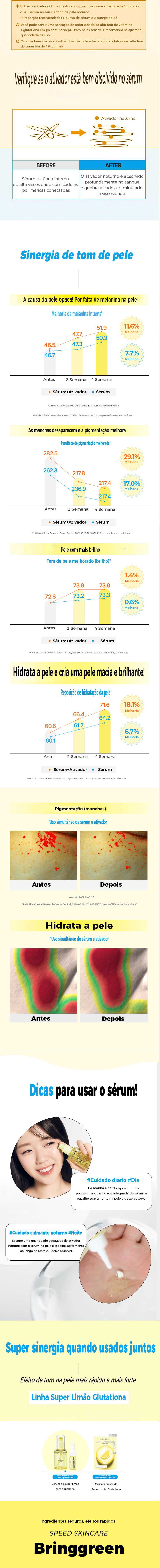 Ácido Ascórbico, Arbutin, Niacinamida, Adenosina, Glutationa, Hesperidina, Alantoína, Retinol, Tocoferol, Ubiquinona, Suco de Limão, 1,2-Hexanodiol, Pantenol, Guaiazuleno Sulfonato de Sódio, Goma Biossacarídeo-1.