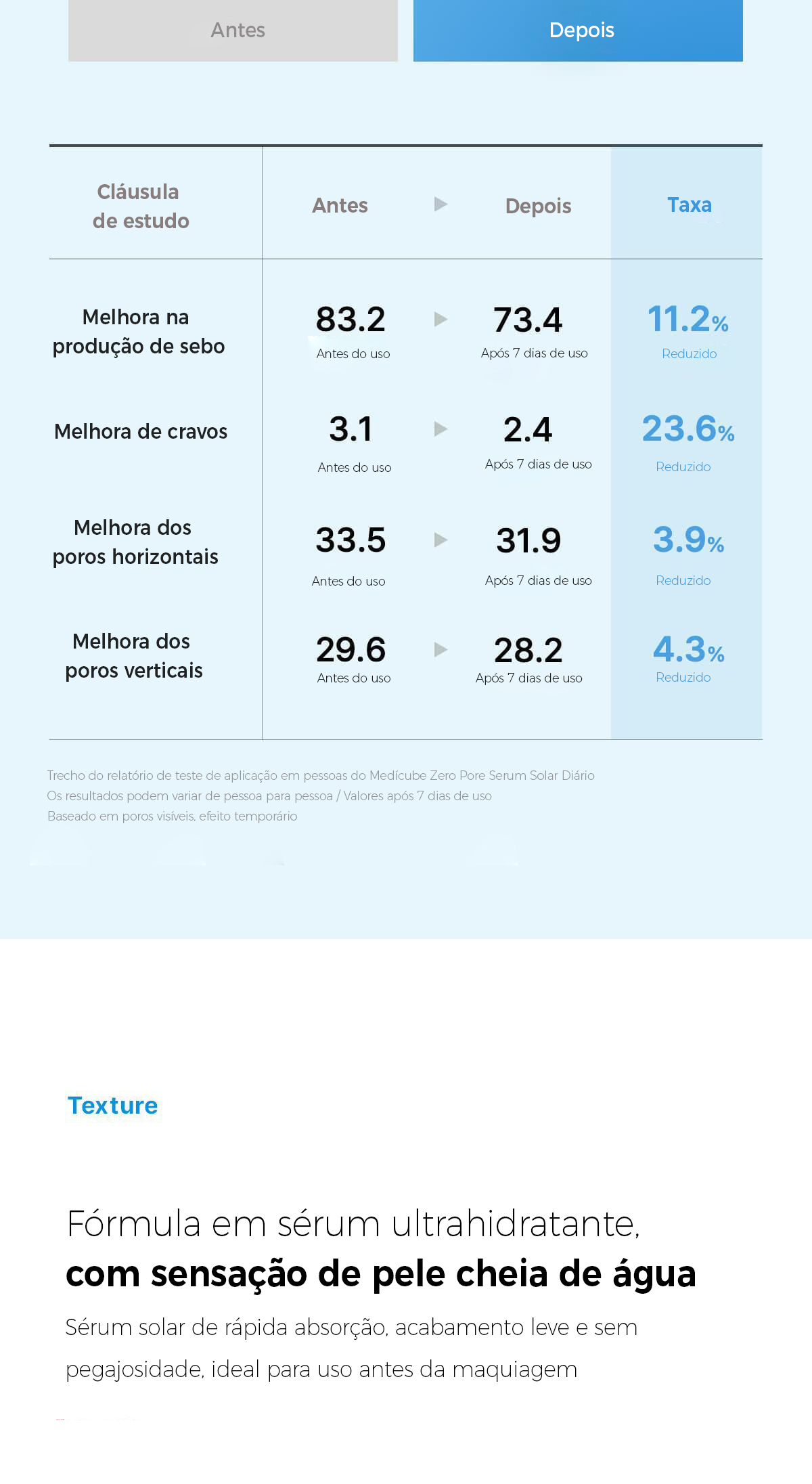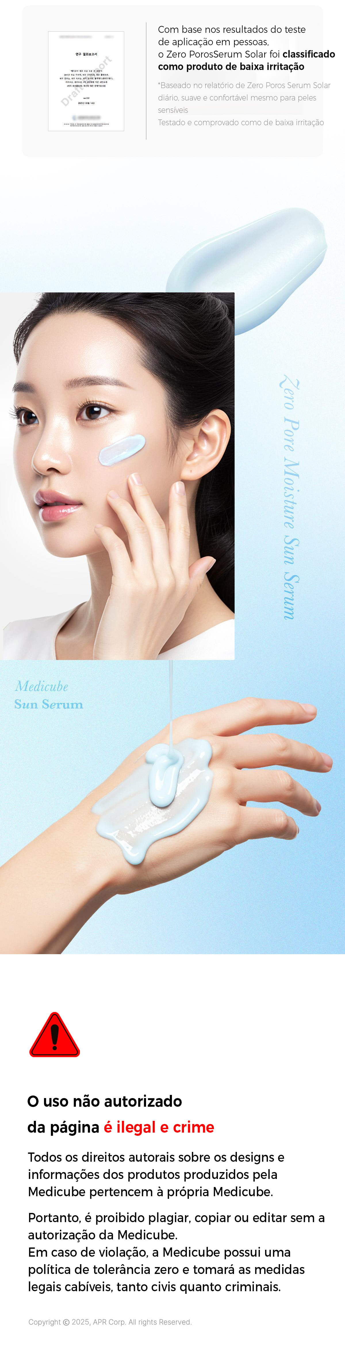 CUIDADOS:1.Em caso de reações adversas, como vermelhidão, inchaço ou coceira durante ou após a exposição ao sol, consulte um médico ou especialista. 2.Evite aplicar em áreas com feridas ou lesões. 3.Mantenha fora do alcance de crianças. 4.Evite a exposição direta à luz solar. *Antes do uso, leia atentamente as instruções e precauções.