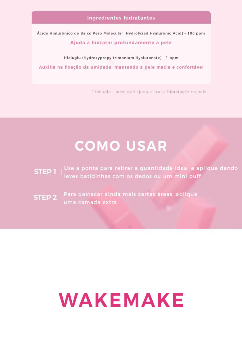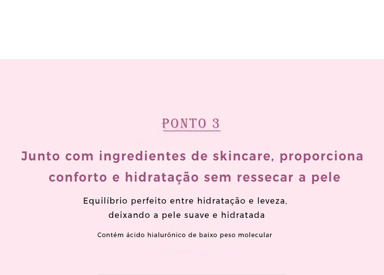 Água purificada, Ciclopentasiloxano, Álcool desnaturado, Glicerina, Trimetilsiloxissilicato, Etilhexanoato de cetila, Trietilhexanoína, Mica (CI 77019), Metil trimeticona, PEG-10 Dimeticona, Copolímero cruzado de metacrilato de metila, Metilpropanodiol, Pentilenoglicol, Dióxido de titânio (CI 77891), Ácido hialurônico hidrolisado, 1,2-Hexanodiol, Cetil PEG/PPG-10/1 Dimeticona, Lauril PEG-10 Tris(trimetilsiloxi)silil etil Dimeticona, Hectorita de disteardimônio, Sulfato de magnésio, Copolímero cruzado de Vinil Dimeticona / Meticona Silsesquioxano, Caprilato de glicerila, Trietoxicaprililsilano, Trissódio Etilenodiamina Dissucinato, Hidróxido de alumínio, Hialuronato de hidroxipropil trimônio, Tocoferol (Vitamina E), Pentaeritritil Tetra-di-terc-butil Hidroxihidrocinamato, Fragrância (Perfume), Óxidos de ferro vermelho (CI 77491), Óxidos de ferro (CI 73360), Óxidos de ferro amarelo (CI 77492), Óxido de ferro preto (CI 77499), Ultramarinos (CI 77007).