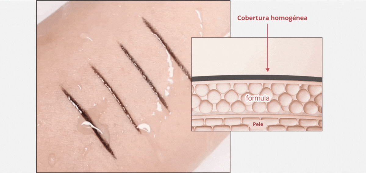 Água purificada, copolímero de acrilato, glicerina, butilenoglicol, pentilenoglicol, behenés-30, poliaspartato de sódio, 1,2-hexanodiol, fenoxietanol, laureth-21, PEG-40 óleo de rícino hidrogenado, copolímero de acrilato de amônio, goma xantana, citrato de sódio, caprilil glicol, etilhexilglicerina, desidroacetato de sódio, dissódio EDTA, tridecés-6 fosfato, dipropilenoglicol, gliceryl caprilate, tocoferol (vitamina E), óxido de ferro vermelho, óxido de ferro preto, carbono negro.