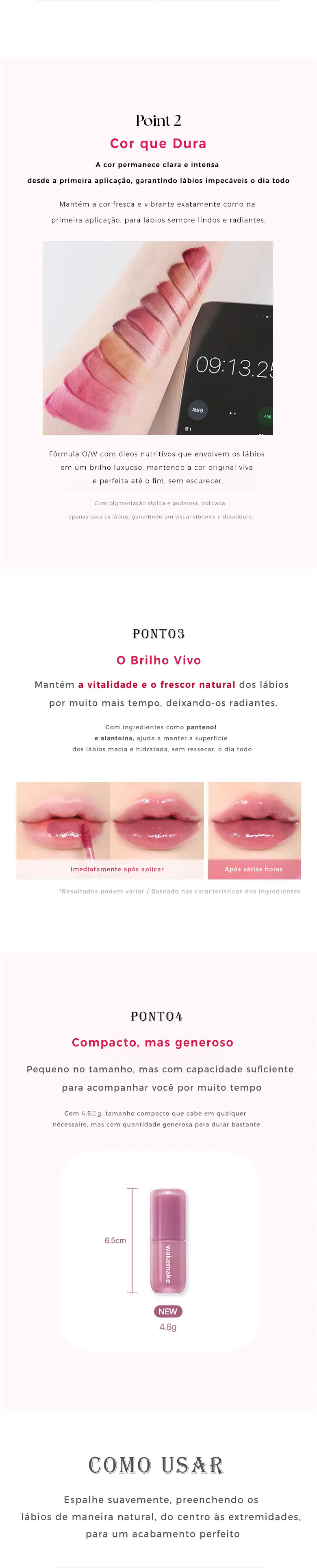 Aplique uma quantidade adequada e pressione (não esfregue) os lábios um contra o outro 2 a 3 vezes.